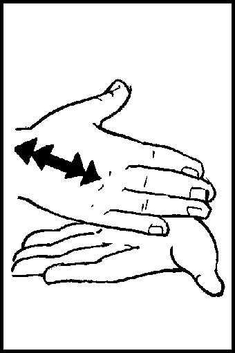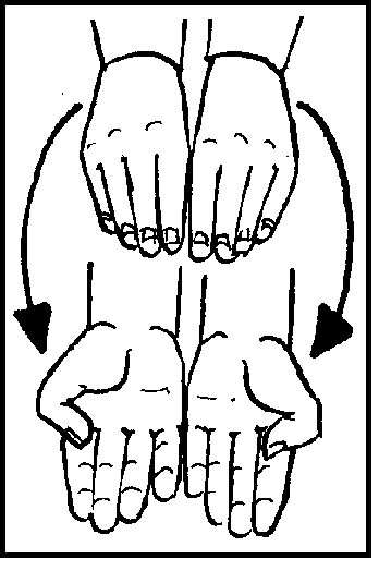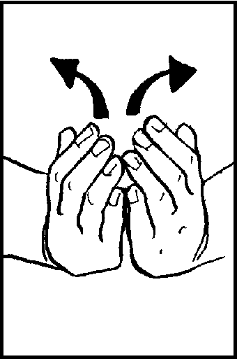 Place palms down, index fingers touching. Move apart in opposing arcs, turning so blades touch, palms up.