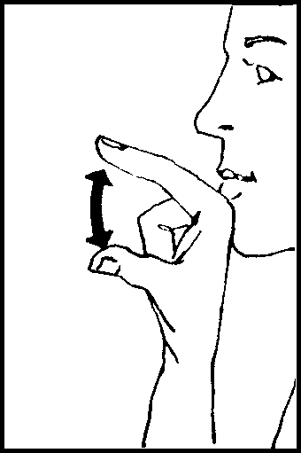 Extend right index finger and thumb. Place under chin. Open and close finger and thumb, twice.