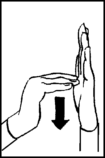 Place fingertips of open right hand, bend at third knuckles, blade forward, into palm of open left hand. Move formation down slightly.
