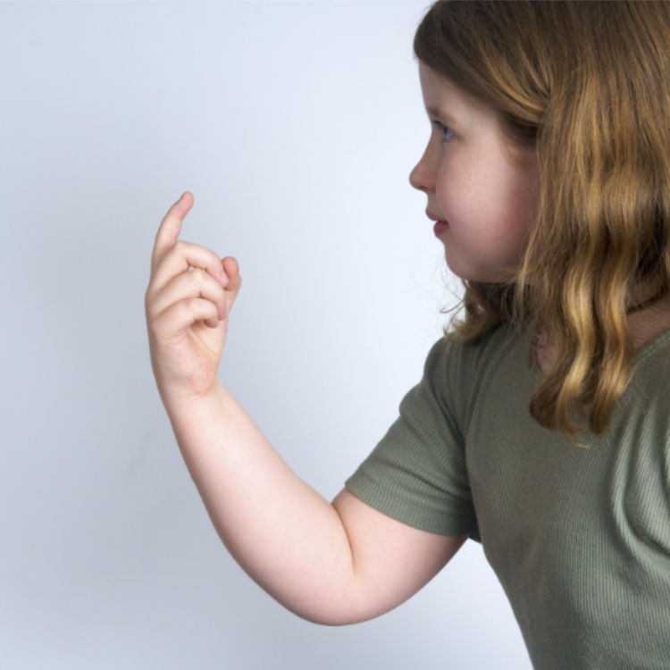 Extend right index finger. Move along left index finger and up side of left thumb.