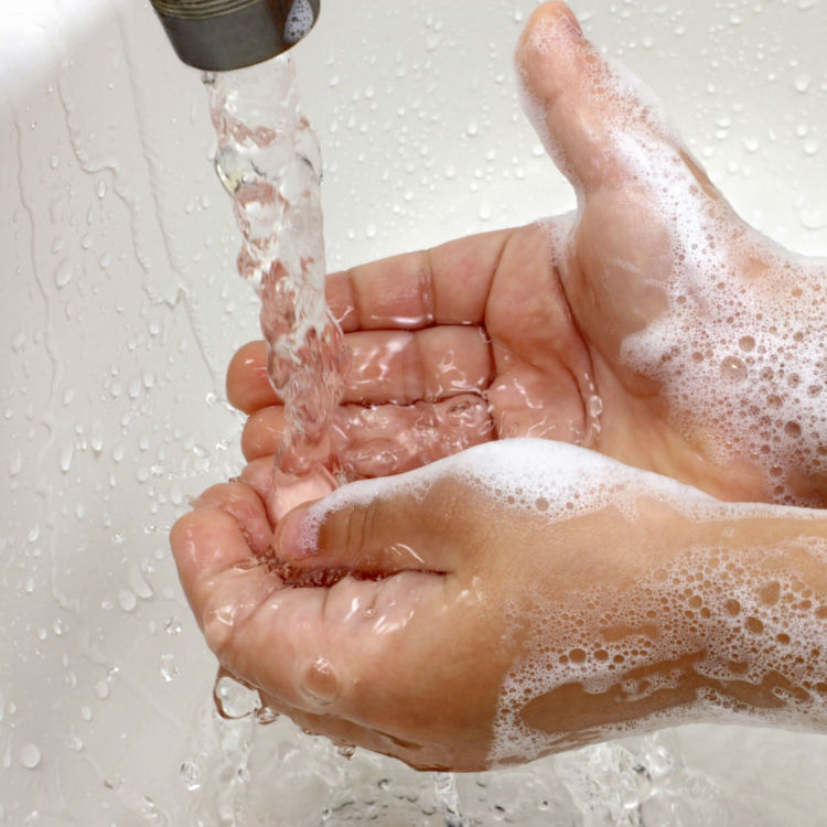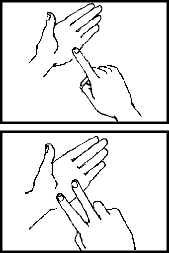 Place tips of extended right index and middle fingers, slightly apart, onto palm of open left hand.